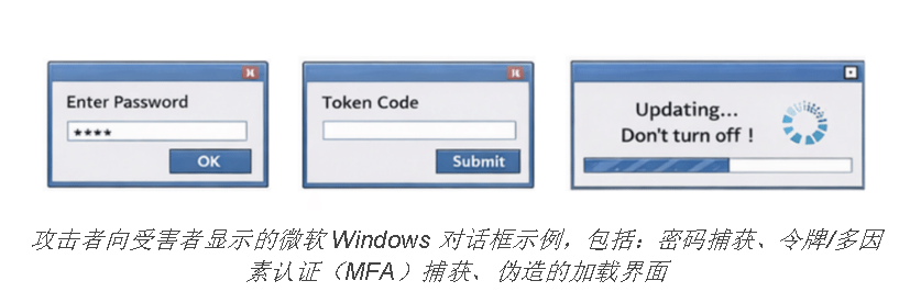 新版本的JanelaRAT采用了一种特殊的交互策略,旨在窃取银行凭证并绕过多因素认证。当检测到目标银行窗口时,该恶意软件会显示一个全屏覆盖窗口,其中包含攻击者发送的图像,该图像模仿合法的银行或系统界面。然后,恶意软件通过显示由攻击者控制的对话框来阻止受害者的交互。这些对话框中的动作对应具体的操作,例如密码捕获、令牌/多因素认证信息捕获、伪造加载界面、伪造的 Windows 更新全屏模态框等。该恶意软件还会调整覆盖窗口的大小、扫描多个屏幕,并加载欺骗性元素,以分散用户注意力或临时隐藏合法的应用程序窗口。