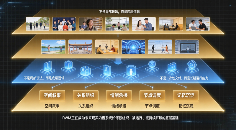 在百年电影发展历程中,技术始终推动着叙事革命。从无声到有声、从黑白到彩色、从胶片到数字、从实拍到虚拟,每一次技术突破都带来电影形态的升级。而在 AI 全面到来的今天,电影正在迎来最彻底的一次变革:从封闭作品转向开放过程,从单向传播转向双向互动,从银幕呈现转向现实共生。要实现这一变革,必须依靠一套能够组织现实、管理情绪、调度现场、积累记忆的底层技术,RWM 系统正是这场变革的核心引擎。