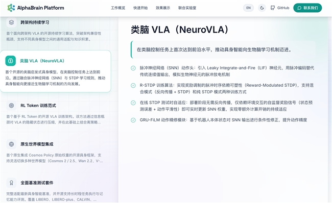 类脑模型被公认为VLA(Vision-Language-Action)的未来方向。传统VLA模型“训练完成即固定”,无法在部署后继续学习。智平方首次在类脑控制任务上达到前沿水平,开源了NeuroVLA——一种可以在真实环境中持续适应的类脑系统。