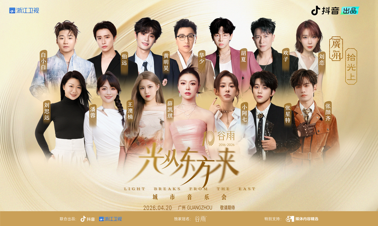 暮春时节,抖音携手新华社客户端、浙江卫视联合发起的“光从东方来·拾光上”城市音乐会在珠江之畔,千年商都广州唯美夜色中划下完美句点。“光从东方来”这场从2025年冬天启程、跨越2026年整个春天的音乐旅程,先后走过北京、西安、广州三座城市,用一首首金曲、热歌把东方美学唱进了年轻人心里。传统文化与流行元素在此交融、碰撞,使得音乐会的高光时刻频频刷爆社交平台,成为年度最具话题度的音乐演出IP之一。