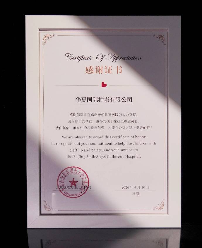活动现场,北京嫣然天使儿童医院为感谢华夏国际拍卖的无私奉献与全力支持,特为企业颁发感谢证书,感谢公司的善举为更多孩子重建笑容,以官方认可定格这份温暖。这份殊荣不仅是对华夏国际本次公益投入的肯定,更是企业长期践行社会责任、深耕公益领域的有力见证。