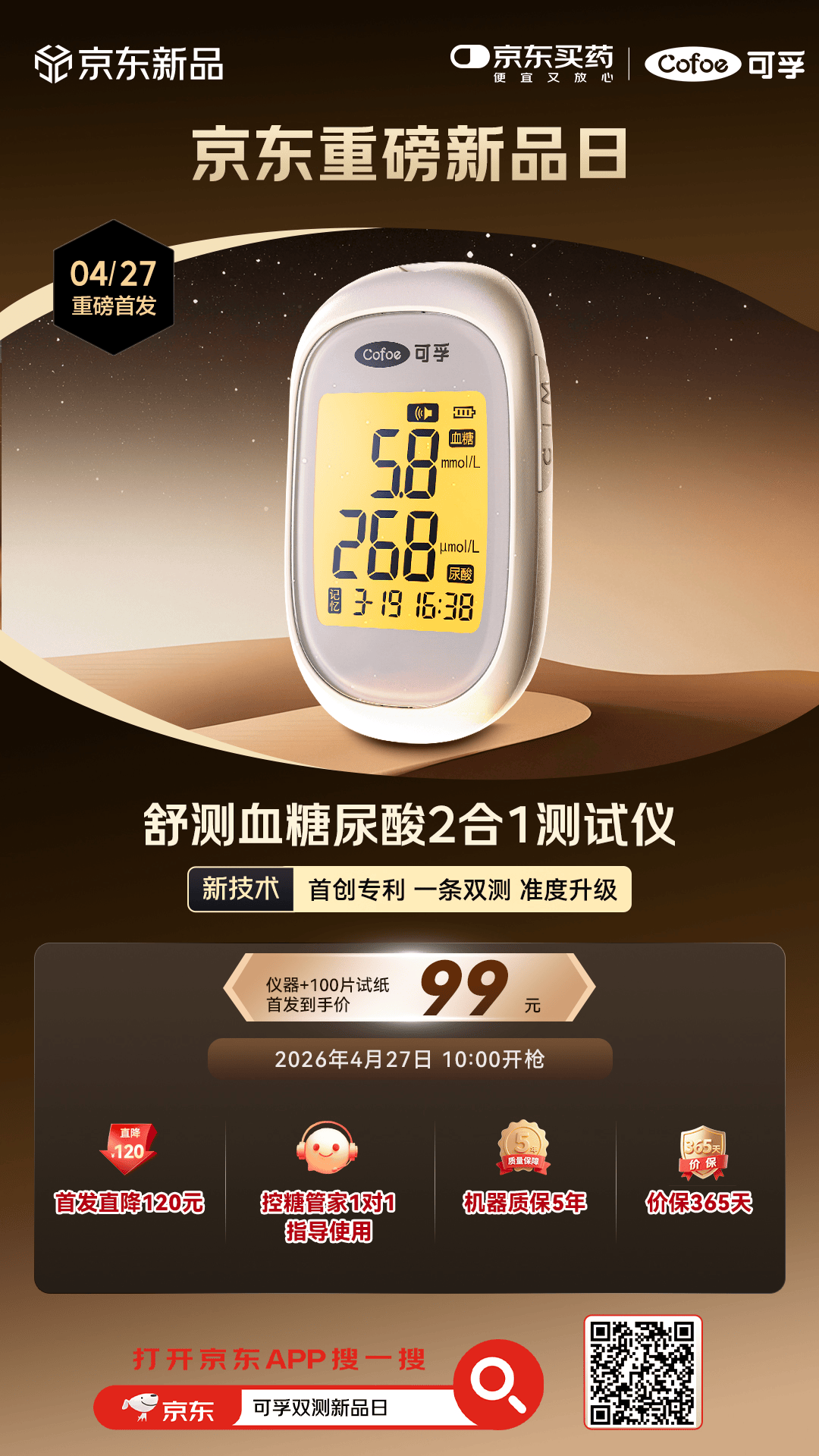 4月27日,可孚医疗多款智能健康监测新品——房颤心律早筛电子血压计与舒测血糖尿酸2合1测试仪,在京东健康独家首发。京东健康依托全球健康新品线上首发平台的优势能力,将专业级居家监测技术送入万千家庭,为用户带来从心脑血管风险预警到慢病指标监测的全方位健康管理体验。