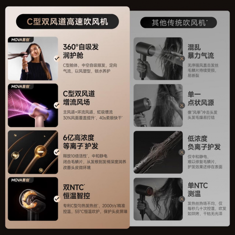 其次是护发表现的改善。传统直筒吹风机因气流路径较长,局部容易产生热量堆积,增加发丝损伤风险。MOVA Aero C配备多点温度监测与动态调节机制,结合C型结构带来的均匀气流,使发丝受热更均衡,有效减少毛躁与热损伤。