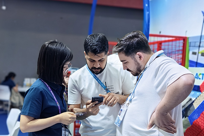 展位上,运动地面系统(人造草、拼装地板)、品质看台座椅、体育照明及排水系统等产品悉数登场,覆盖专业赛事到休闲场景,吸引欧洲、中东、东南亚、非洲等多地采购商现场测试、咨询洽谈。不少客户当场预约工厂参观,意向订单持续涌现。