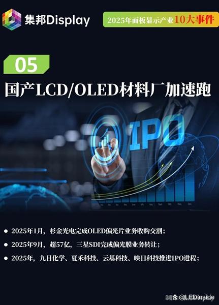 2025年,面板行业呈现出国产零组件持续深化的趋势。在偏光片领域,随着日韩厂商相继退场,市场逐步由国内厂商主导。具体例子包括杉金光电完成对LG化学旗下在中国大陆、韩国及越南的OLED偏光片等业务(SP业务)及相关资产的收购交割;恒美光电完成收购三星SDI偏光片业务等。产能建设方面,根据集邦Display截至2025年5月底不完全统计,当时国内正在推进建设的偏光片项目总投资超100亿元。
