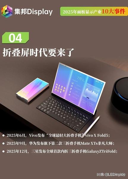 高世代OLED的鸣枪起跑、供应链国产化的深耕自立、扩产浪潮下的格局重塑,以及折叠屏形态的百花齐放——这些关键词构成了2025年显示产业波澜壮阔的底色。随着2025年的收官以及2026年的钟声敲响,AI不断进化下的显示技术革新,地缘政治冲突影响下的出海建厂计划、苹果入局预判下的折叠手机市场质变等或许将成为新一年的讨论热点。2025年的收官,只是显示产业重塑格局的序章。在AI技术的深度融合下,一个由中国企业领航、全球深度协同的“大显示”时代,正徐徐拉开帷幕。(文:集邦Display)
