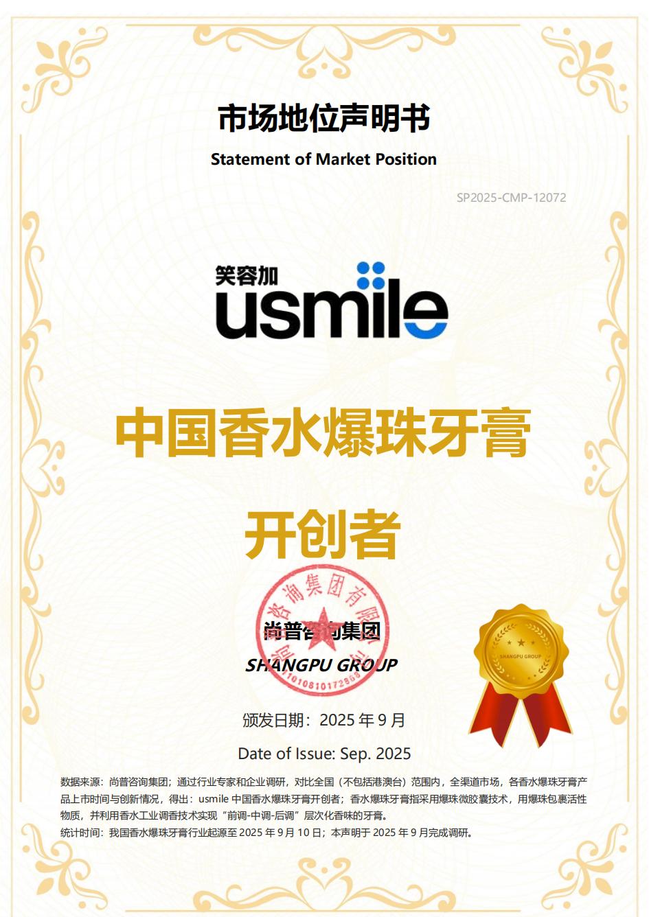 尚普咨询集团:知名牙膏品牌usmile荣获尚普咨询系列市场地位声明