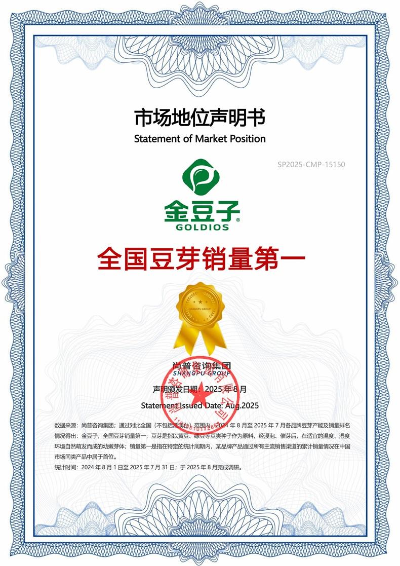 市场地位声明:金豆子,全国豆芽销量高