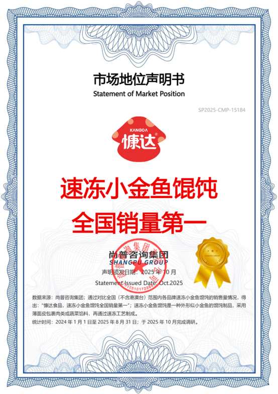 慷达食品荣获“速冻小金鱼馄饨全国销量第一”等多项市场地位声明